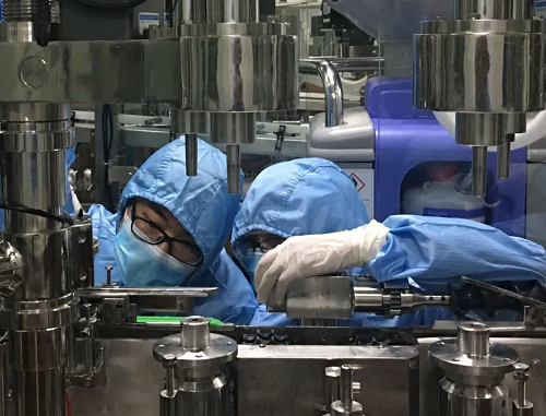 國藥現(xiàn)代致君制藥設(shè)備部員工小心翼翼維護(hù)、呵護(hù)著生產(chǎn)設(shè)備。