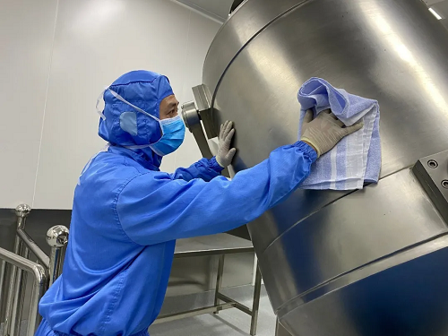 國藥現(xiàn)代上海事業(yè)部總混崗位車間員工愛惜地擦拭著生產(chǎn)設(shè)備。