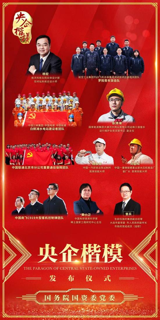 國資委黨委發(fā)布的2022年度“央企楷模”是:航天科技楊宏,航空工業(yè)集團殲20飛機總裝集成測試技術(shù)應(yīng)用攻關(guān)團隊/羅陽青年突擊隊,中國三峽集團、中國電建、中國能建白鶴灘水電站建設(shè)者團隊,國家能源集團徐博海,中國聯(lián)通北京市分公司重要通信保障團隊,中國一汽楊永修,中國一重劉伯鳴,中國商飛C919大型客機控制律團隊,中國有研黃小衛(wèi),國藥集團曾兵。