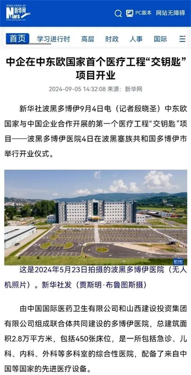 波黑當(dāng)?shù)貢r(shí)間9月4日,由國藥集團(tuán)下屬國藥國際主導(dǎo)建設(shè)的波黑多博伊醫(yī)院開業(yè)運(yùn)營,這是中企在中東歐國家首個(gè)醫(yī)療工程“交鑰匙”項(xiàng)目,也是第八次中國-中東歐國家領(lǐng)導(dǎo)人會晤重要成果。這所綜合性醫(yī)院總建筑面積2.8萬平方米,床位450張,配備核磁共振成像、CT等來自中國等國家的先進(jìn)設(shè)備,是當(dāng)?shù)?0年來最大規(guī)模、最高標(biāo)準(zhǔn)醫(yī)療衛(wèi)生項(xiàng)目,也是國藥國際高質(zhì)量建設(shè)“健康絲綢之路”和人類衛(wèi)生健康共同體新亮點(diǎn)。